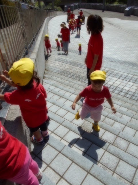 It's the beginning of the weekend so we had a short Morning Circle and after that we went out. Today we played in 階段広場. Children had so much fun with the climbing stairs there.